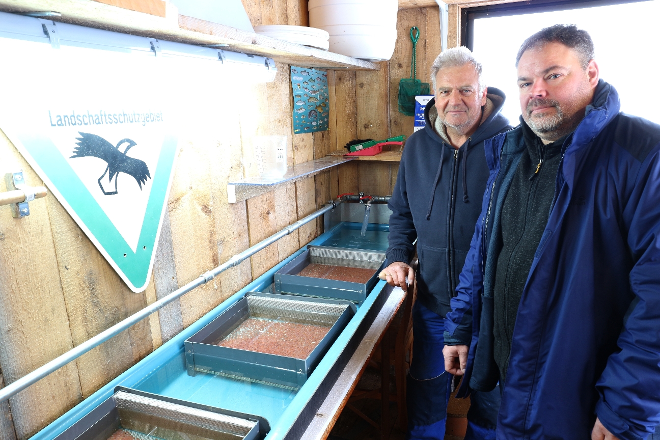 Auch diesem Jahr wird der Verein der Riegseefischer in gemeinsamer Kooperation mit dem Fischereiverein Murnau e.V. eine Aufzucht von Bachforellen durchführen. Verantwortlich dafür ist das bewährte Team mit Sigi und Stefan. Mit Beginn der 2. Dezemberwoche sind ca. 70 000 (!!!!) Bachforelleneier in den Aufbrutrinnen. "Die Anzahl von 70 000 Eiern ist nun das Maximum. Mehr geht nicht." so Sigi. "Wenn das Entwicklungsstadium der Dottersacklarve erreicht ist, haben wir bei 70 000 Forellen täglich wirklich viel Arbeit. Ziel ist es Anfang März die jungen Forellen in unseren Gewässern auszusetzen." so Stefan.