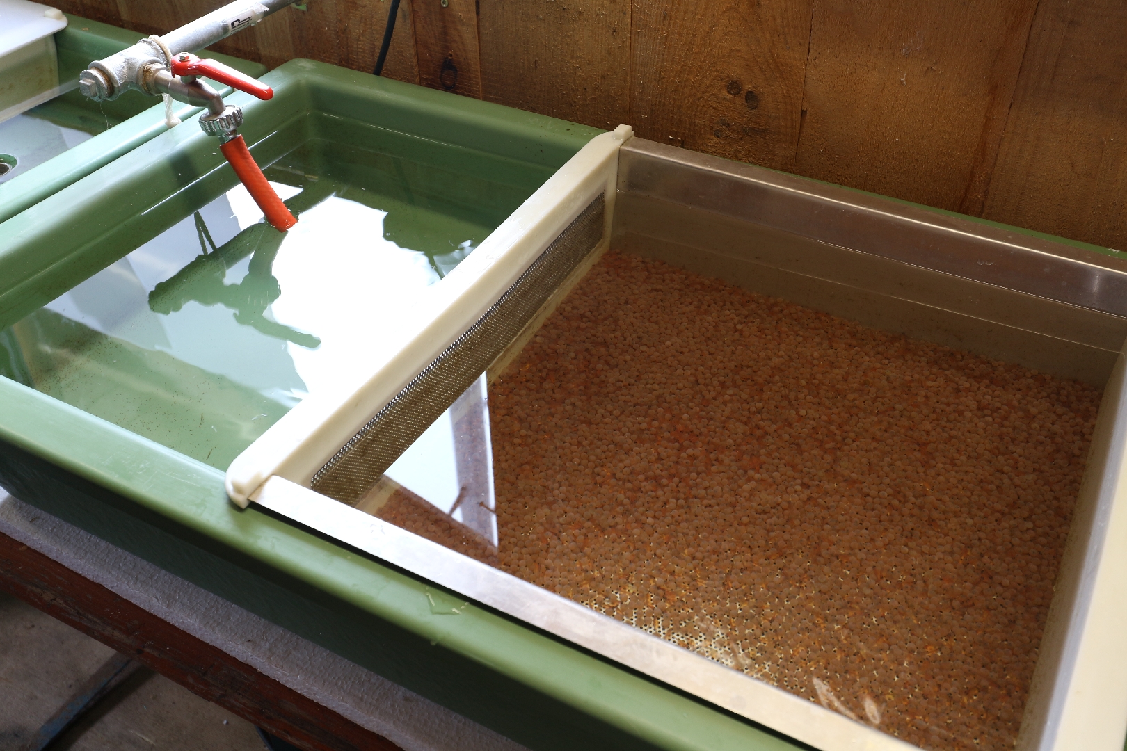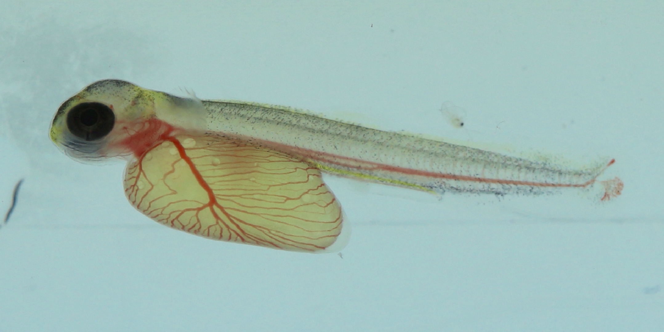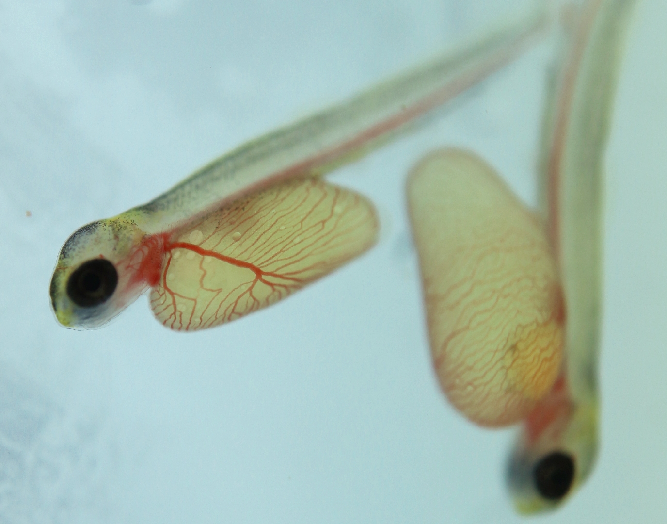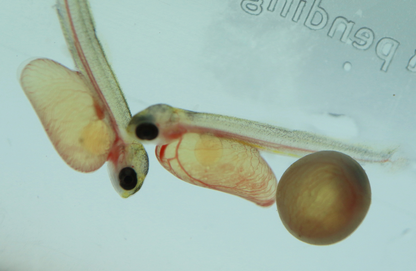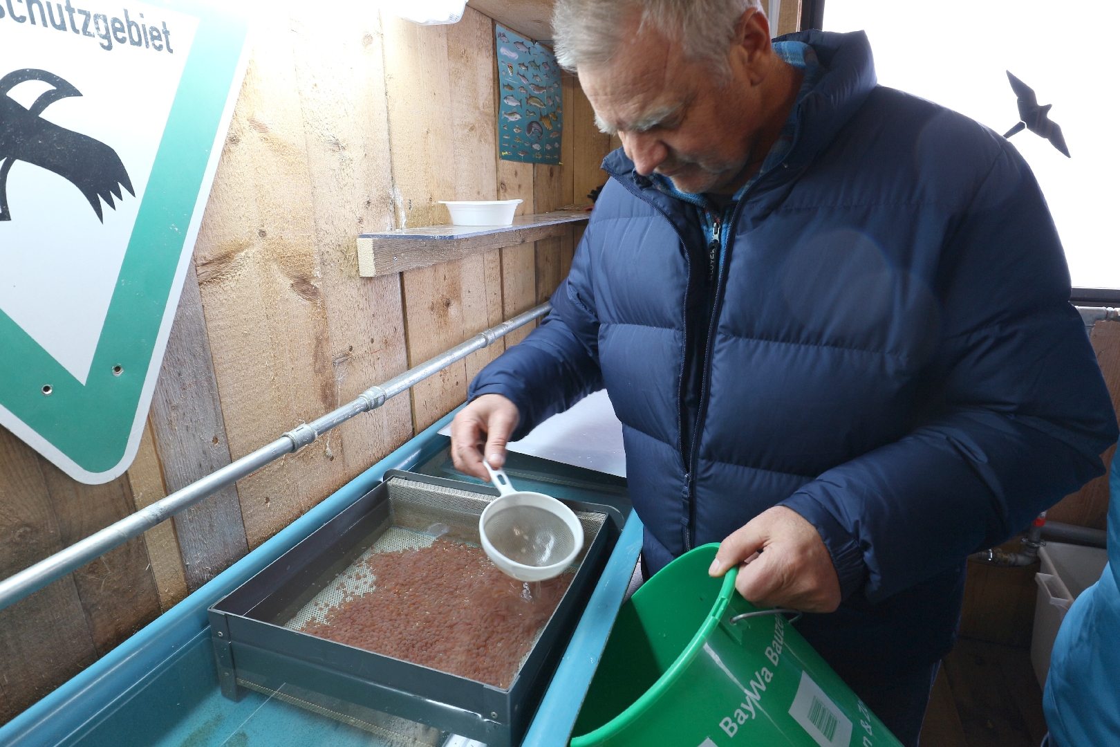 Die ersten kleinen Forellen haben sich nun vom Eipunktstadium zum Dottersackstadium entwickelt.