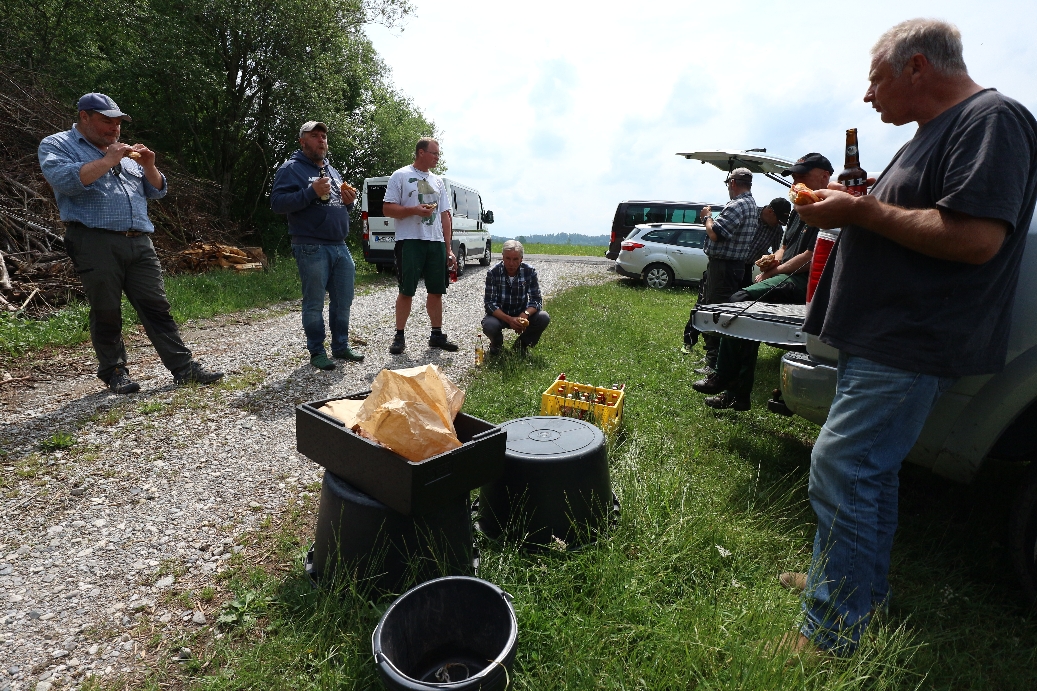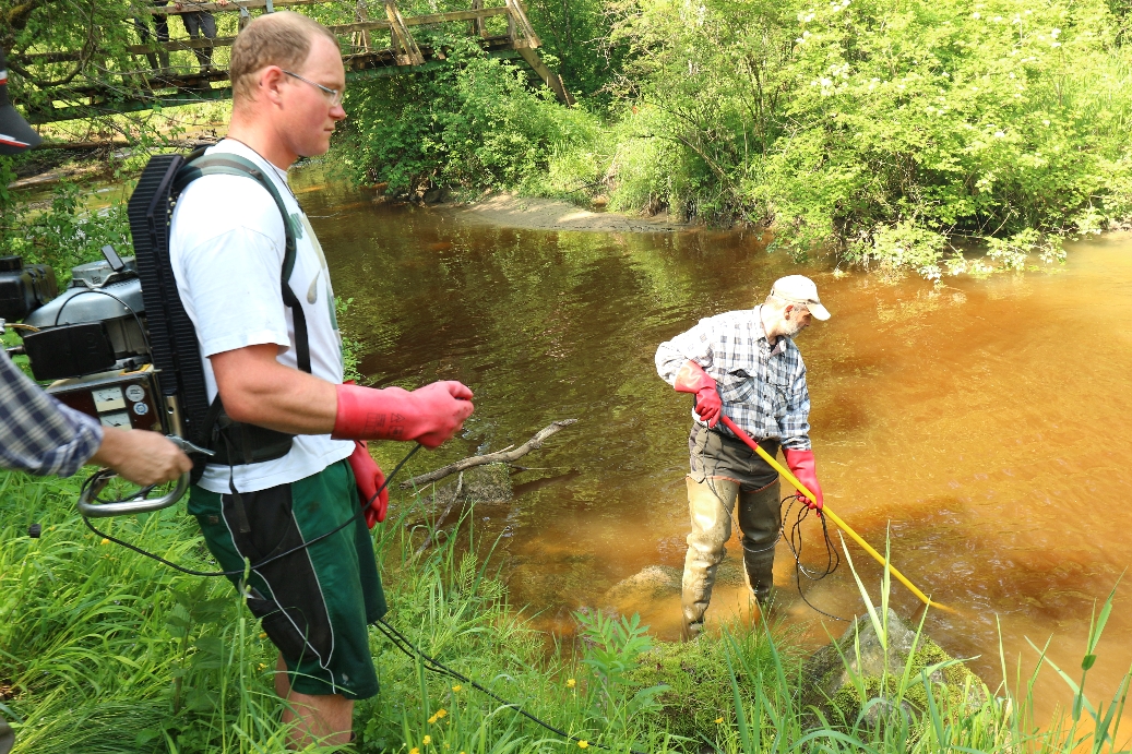 Nach der Sicherheitsbelehrung ging´s los. Leider stellte sich schon sehr bald heraus, dass das Gerät technisch nicht einwandfrei funktionierte. Die zum Elektrofischen notwendige Spannung konnte das Gerät nicht erzeugen und trotz mehrfachen Versuchens gelang es auch nicht das Gerät zu reparieren. So wurde die Aktion dann abgebrochen.